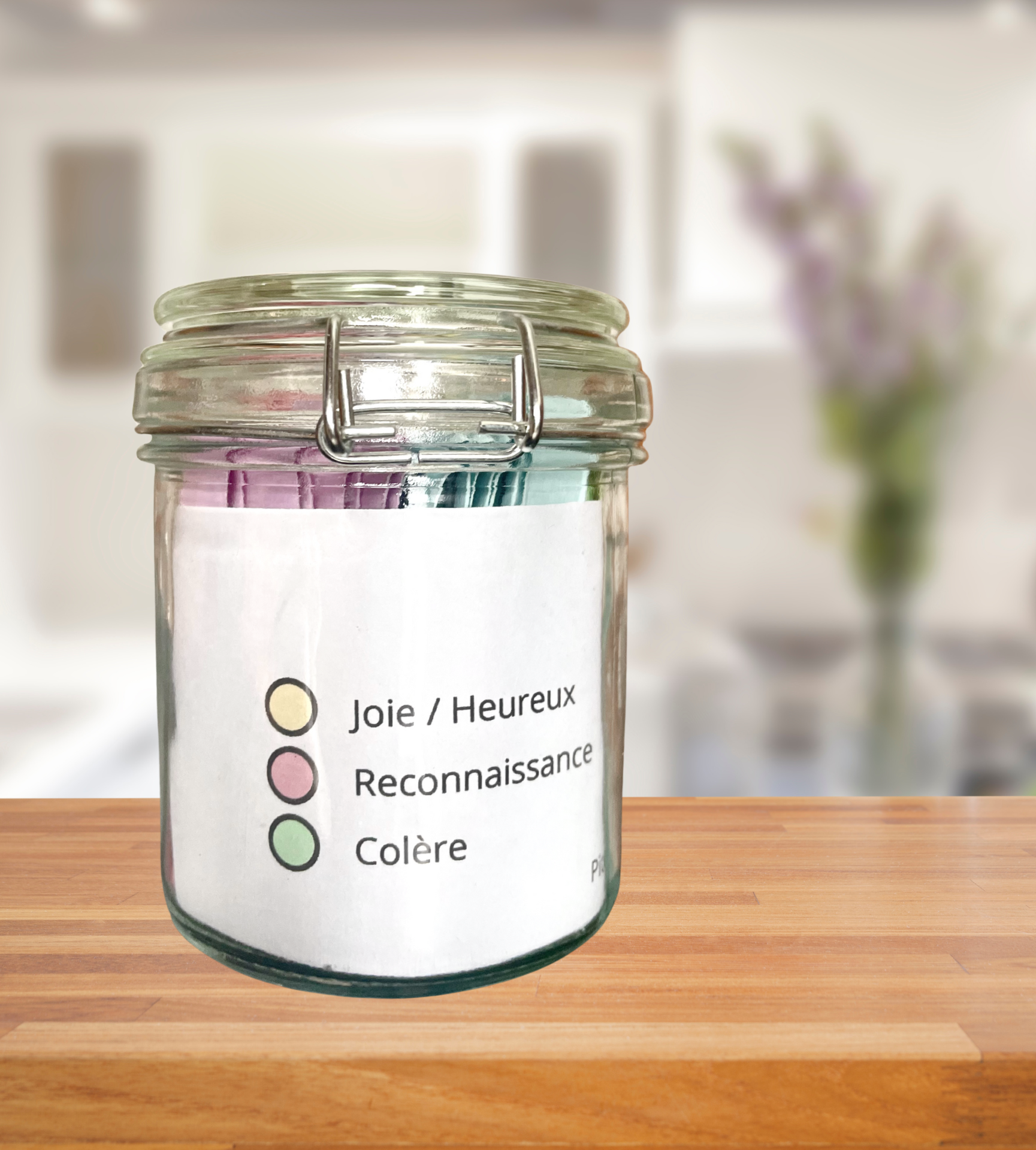 Bocal en verre contenant 96 versets bibliques soigneusement sélectionnés, répartis en 6 émotions pour accompagner chaque moment de vie :